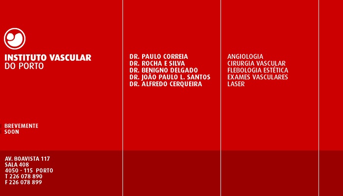 Abracei um novo e mais abrangente projeto. Em conjunto com outros colegas que, na sua maioria, comigo trabalham há varios anos, e em parceria com o Hospital Lusíadas - Porto (HLP), criamos o Instituto Vascular Lusíadas Porto (IVLP), situado no 6º andar do Hospital Lusiadas na Avenida da Boavista 171, Porto. Assim toda a minha atividade clinica será transferida para o IVLP, a partir de 01/OUT/2020, mantendo-se, caso não me informe de vontade em contrario, todos os agendamentos já efetuados (consultas, tratamentos, cirurgias, etc.) no mesmo dia e hora marcados. Qualquer dúvida por favor contactar para os telefones existentes: 226078890 919799457 226085514 963128278 Se preferir poderá fazê-lo através dos email: sandranunes@ivas.pt cristiana.lobo.leitão@lusiadas.pt paulo.dinis.correia@lusiadas.pt Com os melhores votos de boa saúde,